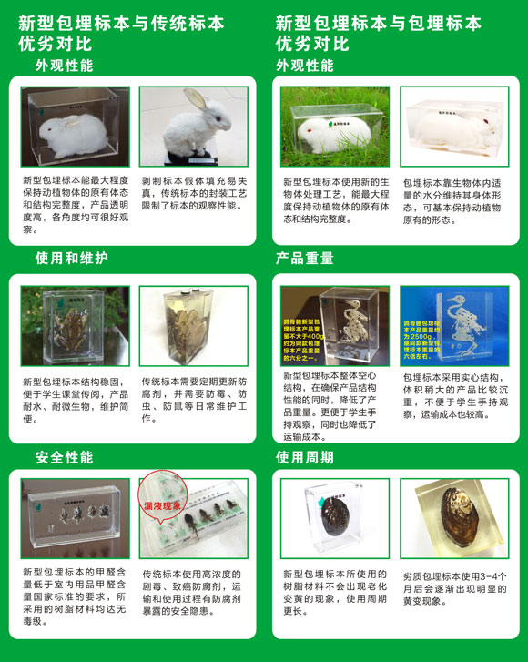 產(chǎn)品運(yùn)用先進(jìn)的動(dòng)植物保色保形干燥工藝,采用高分子材料對(duì)干燥的生物體等標(biāo)本材料進(jìn)行滲透和包裹后,封裝制作而成的一種新型的包埋標(biāo)本產(chǎn)品。產(chǎn)品為空心結(jié)構(gòu),輕便易觀察。標(biāo)本真實(shí)自然,生物形態(tài)飽滿。是一種長(zhǎng)期展示和非常便于教學(xué)的新型包埋標(biāo)本。